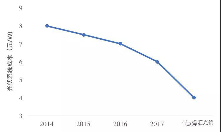 2014年~2018年,光伏系統(tǒng)造價仍然持續(xù)降低,但下降速度明顯低于2008~2013年,具體如下圖所示。