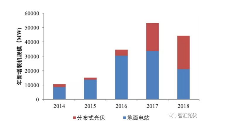 2014年~2018年的年新增裝機在10~53GW之間,巔峰出現(xiàn)在2017年,具體如下表所示。