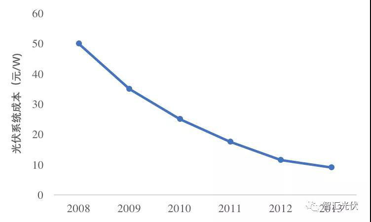 在裝機規(guī)模大幅增加的促進下,2009年、2010年,國內(nèi)光伏系統(tǒng)價格出現(xiàn)了明顯下降,并網(wǎng)光伏電站的系統(tǒng)價格,在2008年50~60元/W的基礎(chǔ)上,幾乎每年下降30%。