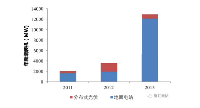 明確的電價政策,讓業(yè)主有了明確的收益預(yù)期,大大激發(fā)了企業(yè)的投資積極性。2011當年,新增裝機就達到2GW,同比增長300%,中國的光伏電站正式進入GW級時代。2013年,年新增裝機甚至達到了近13GW。