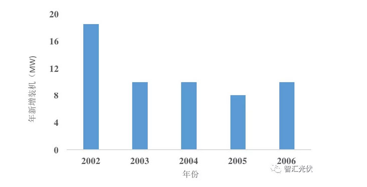 由于全部是政府項目,無市場化運作機制,2002~2006年期間,光伏的年新增裝機并未出現(xiàn)大幅的增長,而是基本穩(wěn)定在10MW/年,如下圖所示。