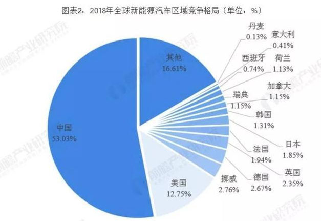 從區(qū)域分布來看,中國是全球最大的新能源汽車市場。2018年,中國新能源汽車銷售占全球新能源汽車銷量的53%;其次是美國,大約占12.7%;另外,挪威(2.8%)、德國(2.7%)、英國(2.3%)、法國(1.9%)、日本(1.9%)、韓國(1.3%)。