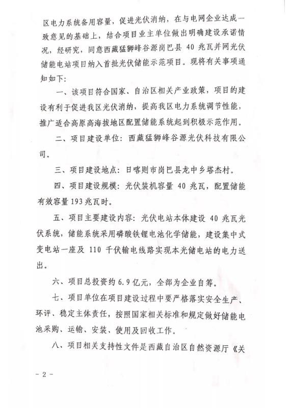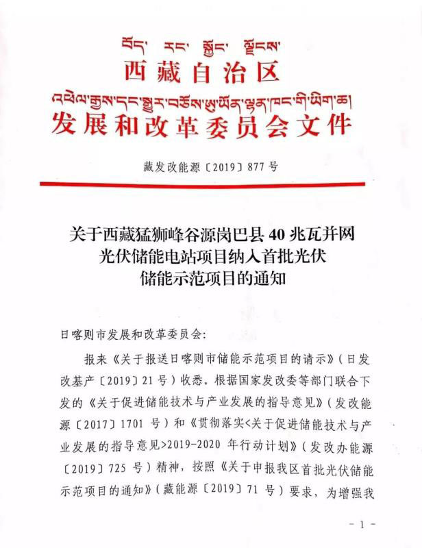 中國儲(chǔ)能網(wǎng)訊:12月26日,西藏自治區(qū)發(fā)展和改革委員會(huì)下發(fā)《關(guān)于西藏猛獅峰谷源崗巴縣40兆瓦并網(wǎng)光伏儲(chǔ)能電站項(xiàng)目納入首批光伏儲(chǔ)能示范項(xiàng)目的通知》(藏發(fā)改能源〔2019〕877號(hào)),批復(fù)同意西藏猛獅峰谷源崗巴縣40MW光伏+193MWh儲(chǔ)能項(xiàng)目納入西藏首批光儲(chǔ)示范項(xiàng)目。文件肯定了西藏猛獅峰谷源崗巴縣40兆瓦并網(wǎng)光伏儲(chǔ)能電站項(xiàng)目推廣高原高海拔地區(qū)儲(chǔ)能系統(tǒng)的積極示范作用。