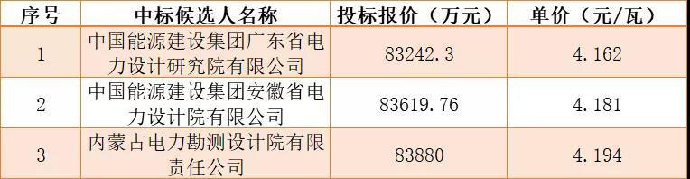 12月26日,廣東臺(tái)山海宴鎮(zhèn)200MWp漁業(yè)光伏發(fā)電項(xiàng)目EPC中標(biāo)候選人公示,中能建廣東省電力設(shè)計(jì)研究院以單價(jià)4.162元/瓦擬中標(biāo),具體如下。