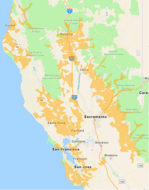 根據(jù)太平洋天然氣和電力公司(PG&E)提供的地圖信息,卡利斯托加市將會(huì)受到森林火災(zāi)的影響。