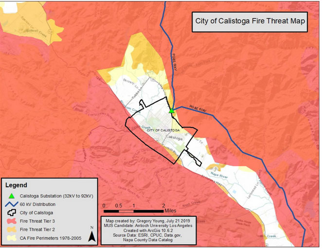 加利福尼亞州有一些地區(qū)已經(jīng)為電力中斷做準(zhǔn)備。例如,加利福尼亞州卡利斯托加市已要求清潔聯(lián)盟進(jìn)行可行性分析,以開發(fā)社區(qū)微電網(wǎng),并作為管理和應(yīng)用加利福尼亞在火災(zāi)高發(fā)季度停電(PSPS)的一種潛在工具。下圖是太平洋天然氣和電力公司(PG&E)發(fā)布的城市火災(zāi)威脅圖,并指出接到城市的60kV電力線具有被森林火災(zāi)影響的風(fēng)險(xiǎn)。