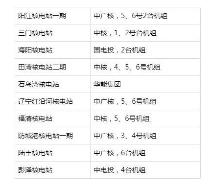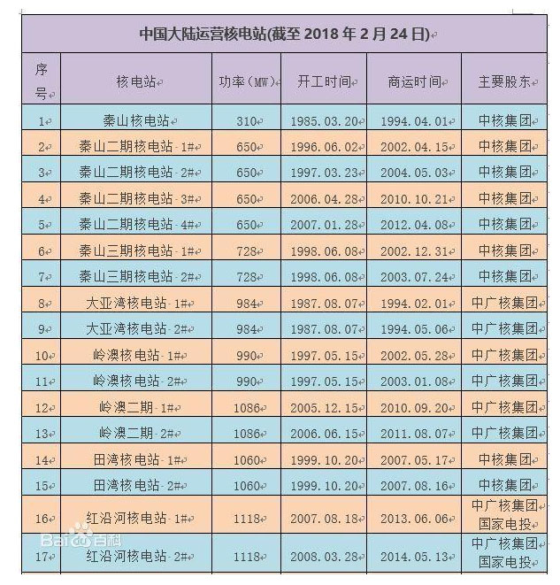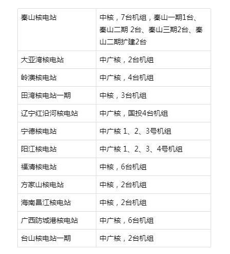 中國建成投產的核電站(截止2018年):