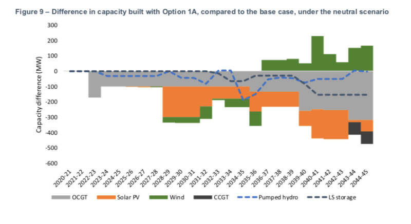 而對于某些人來說,首選的1A方案將是一個壞消息。首先,這將導(dǎo)致峰值天然氣發(fā)電廠(灰色的OCGT)所需的容量減少,而太陽能發(fā)電廠的容量(橙色)和兩個風(fēng)力發(fā)電場所需的發(fā)電量減少,盡管目前還沒有真正的洞察到這些驅(qū)動因素,但長期來看將會部署更多的風(fēng)力發(fā)電設(shè)施。