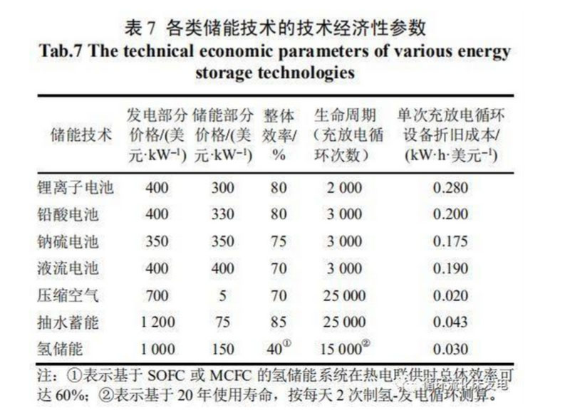 氫儲能相較于其他儲能方式的劣勢在于能源轉(zhuǎn)化效率低、成本高。美國Sandia國家實驗室在2015年發(fā)布了關(guān)于儲能技術(shù)經(jīng)濟(jì)性分析的報告,總結(jié)了各種已商業(yè)化的儲能技術(shù)的價格、效率及使用壽命,見表7。目前常用電化學(xué)電池的效率為70%~80%,而氫儲能系統(tǒng)即便在考慮熱電聯(lián)供的條件下效率也僅有40%左右。