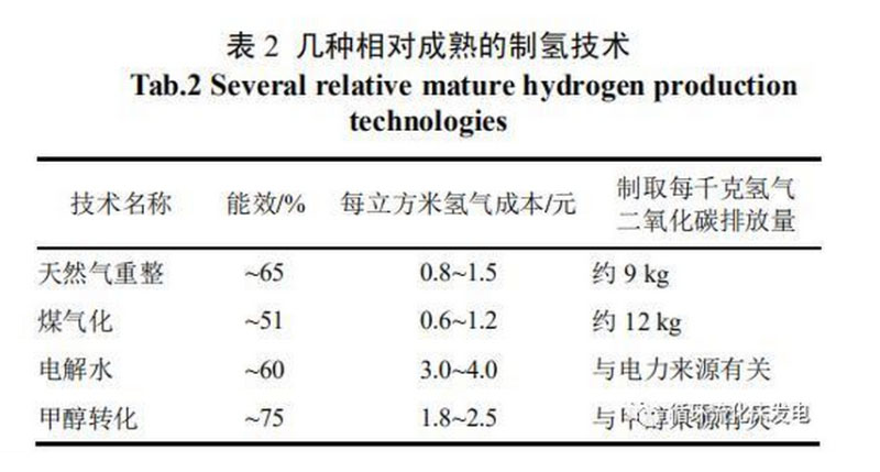 目前,主要以煤或天然氣等為原料來制取氫氣,來源于化石燃料的氫氣約占?xì)錃饪偖a(chǎn)量的95%。幾種相對成熟的制氫技術(shù)見表2。我國是世界上氫氣產(chǎn)量最大的國家之一,年產(chǎn)氫氣量約2000萬t,占世界氫總產(chǎn)量的1/3,并以煤氣化制氫為主。在煤炭價格為500元/t的情況下,煤制氫的成本約0.7元/m3。但是,此類技術(shù)需要結(jié)合CO2捕集和封存技術(shù)才能解決碳排放問題,因此不能作為氫能的長久來源。
