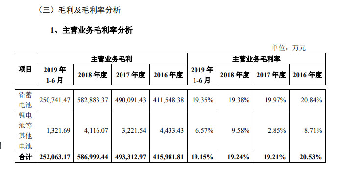 近日,天能股份亦對外披露了招股說明書(申報稿)。2018年,天能股份營收達358.63億元,凈利潤(指歸屬于母公司所有者的凈利潤,下同)逾12億元。2019年上半年,公司營收為207.56億元,凈利潤為4.68億元,同比下滑了逾11%,公司資產(chǎn)負債率逾77%。