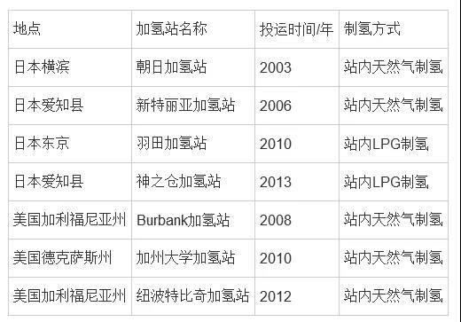 站內(nèi)天然氣制氫是未來加氫站發(fā)展的趨勢之一。目前日本和美國的站內(nèi)天然氣制氫(包括液化石油氣(LPG)制氫)的加氫站(部分)見表6。