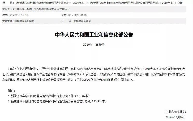 在動(dòng)力電池大規(guī)模退役潮到來(lái)之際,近日,工信部正式發(fā)布了《新能源汽車廢舊動(dòng)力蓄電池綜合利用行業(yè)規(guī)范條件(2019年本)》(簡(jiǎn)稱《規(guī)范條件》)和《新能源汽車廢舊動(dòng)力蓄電池綜合利用行業(yè)規(guī)范公告管理暫行辦法(2019年本)》,此前在2016年公布的《新能源汽車廢舊動(dòng)力蓄電池綜合利用行業(yè)規(guī)范條件》和《新能源汽車廢舊動(dòng)力蓄電池綜合利用行業(yè)規(guī)范公告管理暫行辦法》(工業(yè)和信息化部公告2016年第6號(hào))同時(shí)廢止。