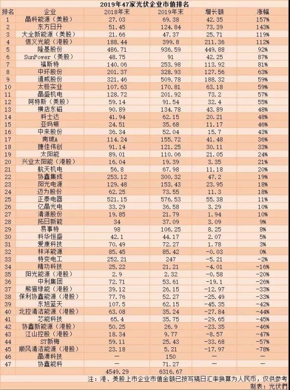 其實,在資本市場,光伏制造企業(yè)與投資企業(yè)面臨的“冰火兩重天”日益凸顯。光伏們統(tǒng)計了47家光伏企業(yè)2019年的市值變化情況,共有33家光伏企業(yè)在2019年實現(xiàn)了市值的上漲,總市值約為6317億元,相比于2018年底上漲了約1800億元。