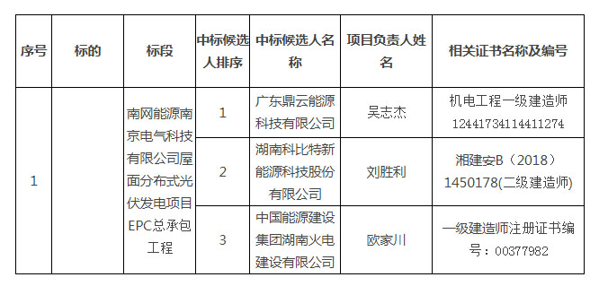 南網(wǎng)能源南京電氣科技有限公司屋面分布式光伏發(fā)電項(xiàng)目EPC總承包工程 (招標(biāo)項(xiàng)目編號(hào):0002200000063187),經(jīng)評(píng)標(biāo)委員會(huì)評(píng)審,現(xiàn)將中標(biāo)候選人公示如下:
