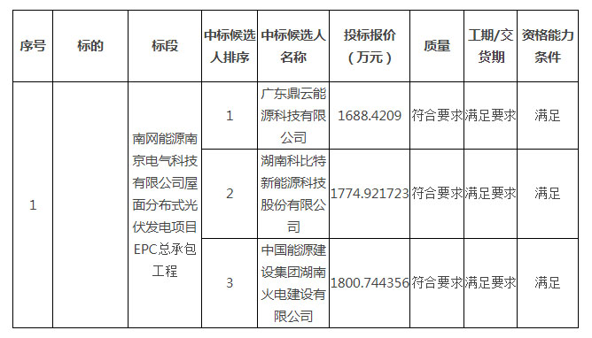 近日,南網(wǎng)能源南京電氣科技有限公司屋面分布式光伏發(fā)電項(xiàng)目EPC總承包工程結(jié)果公示,據(jù)公告顯示,該項(xiàng)目總規(guī)模為5.98114MW,其中,廣東鼎云能源科技有限公司以2.82元/W,共計(jì)1688.4209萬(wàn)元位列第一中標(biāo)候選人;湖南科比特新能源科技股份有限公司以2.97元/W,共計(jì)1774.921723萬(wàn)元位列第二中標(biāo)候選人;中國(guó)能源建設(shè)集團(tuán)湖南火電建設(shè)有限公司以3.01元/W,共計(jì)1800.744356萬(wàn)元位列第三中標(biāo)候選人。