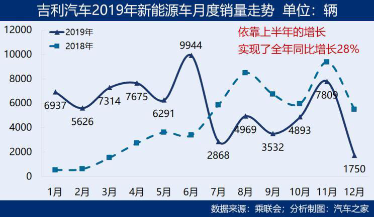 吉利汽車2019年累計(jì)銷售新能源乘用車6.96萬(wàn)輛,同比增長(zhǎng)28.1%,其中純電動(dòng)車型5.19萬(wàn)輛,插電式混合動(dòng)力車型1.77萬(wàn)輛。吉利汽車是四家頭部車企中唯一正增長(zhǎng)的,當(dāng)然,新車上市是一個(gè)非常重要的原因。
