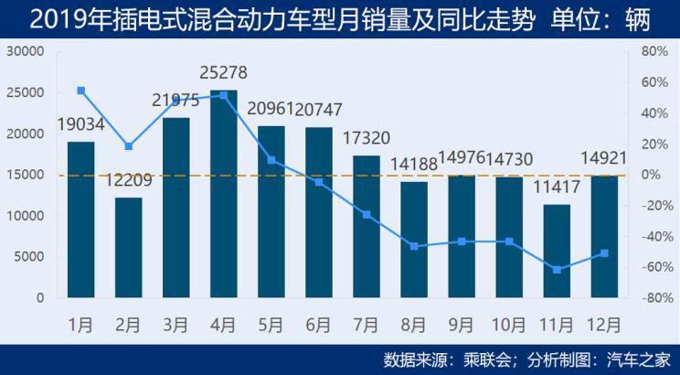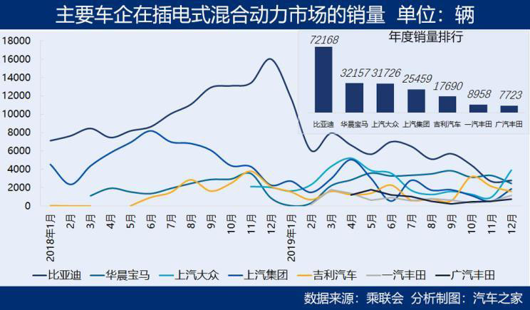 今年插電式混合動(dòng)力市場(chǎng)整體走弱,全年累計(jì)銷售20.8萬(wàn)輛,其中12萬(wàn)輛是在上半年完成的,下半年每個(gè)月的同比跌幅都在40%左右。與純電動(dòng)市場(chǎng)以中國(guó)車企為主不同,插電式混動(dòng)市場(chǎng)有更多的合資車企進(jìn)入。