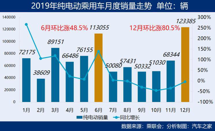 原本在盛夏既已“入冬”的新能源車市,卻于真正的隆冬中突現(xiàn) “陽(yáng)春”,12月銷量止跌回升,環(huán)比大漲52.3%,收于13.83萬(wàn)輛,并且成為2019年度銷量最高的月份。