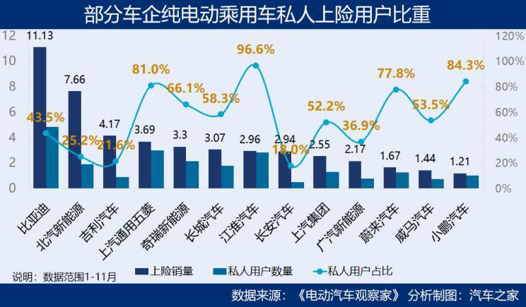 即便以46%作為私人用戶比的平均值,可以發(fā)現(xiàn)不少企業(yè)仍然是低于這個(gè)值的。比如比亞迪、北汽新能源、吉利汽車,這三家上險(xiǎn)銷量排在前三的企業(yè),其純電動(dòng)汽車的私人用戶比重均未達(dá)到平均水平。當(dāng)然,各車企旗下不同的車型在用戶結(jié)構(gòu)上是不同的,那些主要投放出行市場(chǎng)的車型,會(huì)拉低企業(yè)的私人用戶比。比如帝豪新能源純電動(dòng)車型是曹操出行的主力車型,比亞迪e5在是多個(gè)城市的出租車用車,榮威Ei5在上海出租車市場(chǎng)上的投放量越來(lái)越多等等。