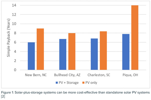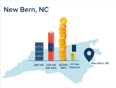 在像新伯爾尼這樣的城市中,商業(yè)需求收費(fèi)高(高于25美元/千瓦),加上使用時(shí)間費(fèi)率(TOU)結(jié)構(gòu),太陽(yáng)能+儲(chǔ)能項(xiàng)目可能是一項(xiàng)非常誘人的經(jīng)濟(jì)投資。其簡(jiǎn)單的投資回報(bào)期只有六年,甚至比獨(dú)立部署的太陽(yáng)能發(fā)電設(shè)施的回報(bào)期還少。對(duì)于北卡羅來(lái)納州一個(gè)典型的中型商業(yè)客戶來(lái)說(shuō),每年將節(jié)省15.5萬(wàn)美元。