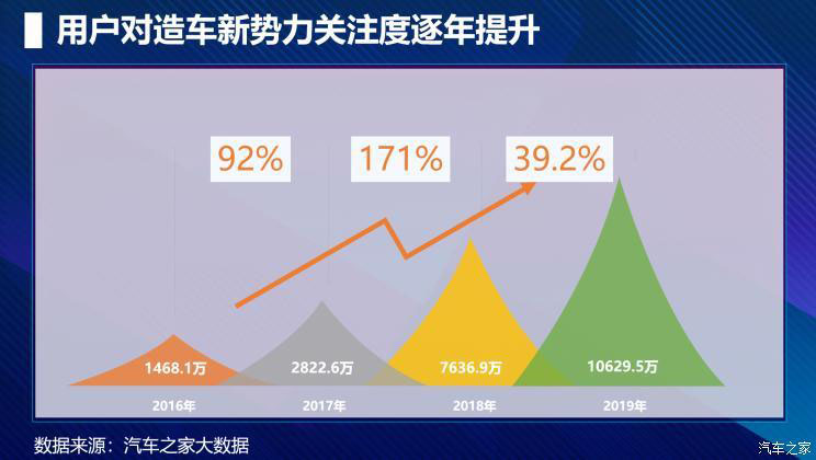 上圖是汽車之家大數(shù)據(jù)統(tǒng)計的“2019年用戶對造車新勢力關注時長”排名TOP 10,這一排名不僅可以說明造車新勢力在用戶心目中的知名度和熱度,也可直觀反映出造車新勢力的活躍度,并以此預判其未來發(fā)展趨勢和行業(yè)地位。從排名中可見,目前造車新勢力熱度與其產(chǎn)品落地速度直接相關,TOP 5的企業(yè)均已有車型在售,產(chǎn)品依然是車企安身立命之本;此外,通過與2018年排名對比可見,兩年中用戶關注時長TOP 10的造車新勢力中有8家重合,證明這8家企業(yè)連續(xù)兩年保持較高的知名度和熱度,身處造車新勢力靠前位置。