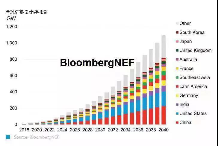 據(jù)彭博新能源財經發(fā)布的《2019全球儲能市場長期展望》顯示,全球儲能市場累計裝機規(guī)模將從2018年的9GW/17GWh增長到2040年的1,095GW/2,850GWh,總投資額達到6620億美元。到2040年,中國和美國將是全球最大的儲能市場。