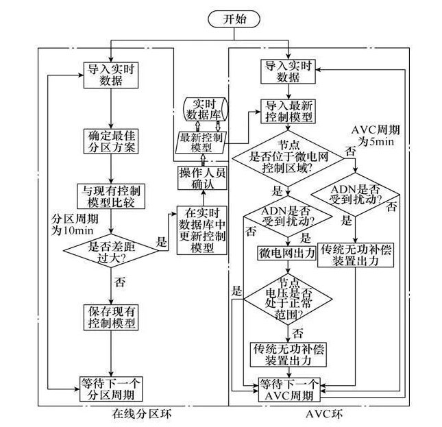 通過潮流計算,獲得電壓靈敏度矩陣,采用聚類算法構建分布式微電網(wǎng)在ADN中的控制空間,確定微電網(wǎng)主導的可控區(qū)域集合。在自動電壓控制(AVC)系統(tǒng)的框架上,提出了考慮微電網(wǎng)參與電壓柔性控制的AVC系統(tǒng)。通過該系統(tǒng)可合理調(diào)度微電網(wǎng)與傳統(tǒng)無功補償設備協(xié)調(diào)運行,并對ADN進行無功補償,實現(xiàn)控制區(qū)域柔性且快速的自動電壓控制,提升ADN電壓質(zhì)量。最后,通過IEEE 33節(jié)點系統(tǒng)驗證了所提策略的有效性。