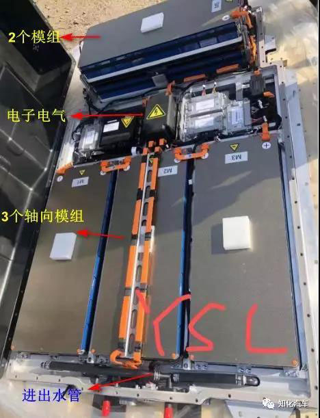 每個模組的上方都有金云母,以防火阻燃,是能看到的明顯安全措施。熱管理方面采用水冷設(shè)計,冷板平鋪在電芯底部(通過導(dǎo)熱膠增加導(dǎo)熱率)。