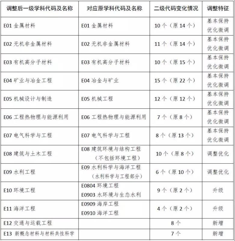 1. 一級學(xué)科由原來的9個調(diào)整為13個:新增2個一級學(xué)科,分別為交通與運載工程和新概念材料與材料共性科學(xué);優(yōu)化升級出2個一級學(xué)科,分別為環(huán)境工程和海洋工程。