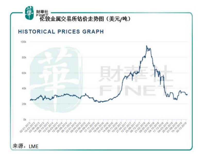 好景不長,剛果的鈷礦產(chǎn)大幅增加,另一方面中國削減對電動車生產(chǎn)商的補貼令需求受壓,觸發(fā)鈷的供過于求,鈷價在2018年見頂之后開始回落,見下圖。