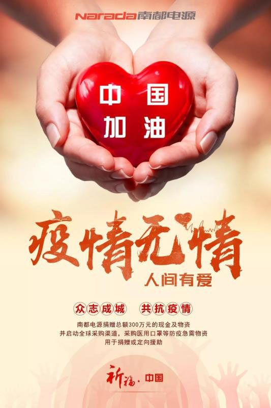 南都電源今天宣布,為支持新型冠狀病毒防疫工作,將捐贈總額300萬元的現(xiàn)金及物資,用于抗擊新型冠狀病毒肺炎疫情。