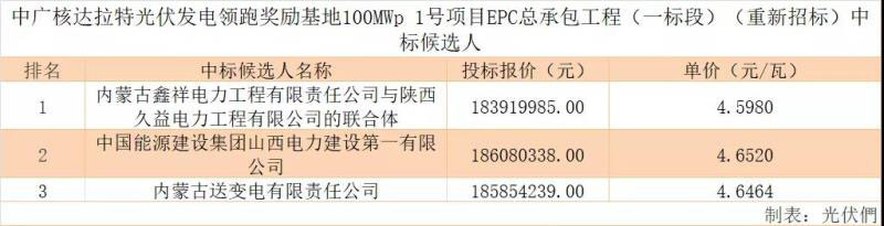 2月3日,中廣核達拉特光伏發(fā)電領(lǐng)跑獎勵基地100MWp 1號項目EPC總承包工程(一標段)(重新招標)中標候選人公示。內(nèi)蒙古鑫祥電力工程有限責任公司與陜西久益電力工程有限公司的聯(lián)合體以183919985元的總報價,單價4.589元/瓦的報價位列第一中標候選人。