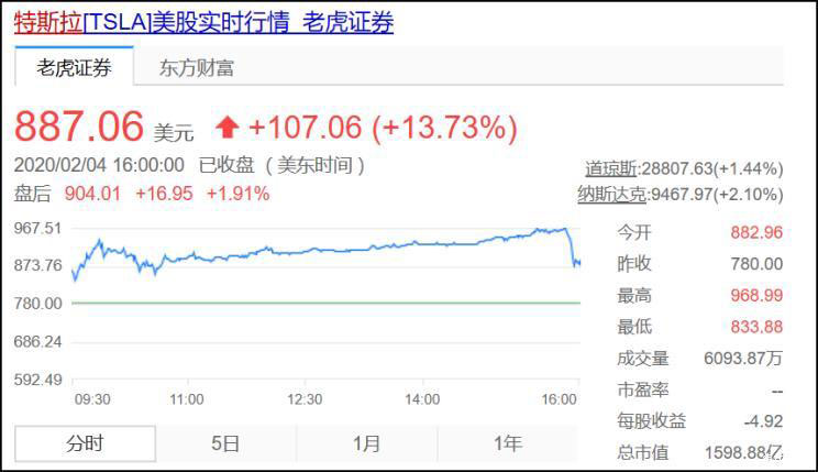 自2019年底突破420美元的關口后,特斯拉股價在2020年初再創(chuàng)新高。截至美國時間2月4日收盤,特斯拉股票上升至每股887.06美元,漲幅13.73%,創(chuàng)特斯拉股價新高峰。