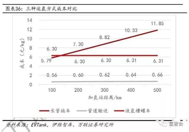 長管拖車的運氫單位成本受距離的影響較大,適合運輸至距離較短的加氫站,但由于目前燃料電池市場規(guī)模較小,氫需求量較小,大多氫源地與加氫站的距離較短,長管拖車運氫仍是短期的主要運氫方式。液氫槽罐車運輸?shù)膯挝怀杀臼芫嚯x的影響較小,適合長距離運輸,但受制于成本和能耗問題,目前還處于導入期,長期來看液氫將會是取代長管拖車運氫的主要運輸方式。