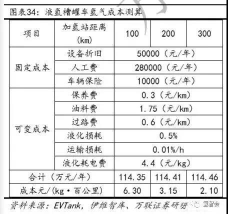 液氫運輸?shù)某杀窘Y構與長管拖車較為類似,但液化成本較高且運輸過程中損耗較大。我們假設運輸過程中每小時損耗0.01%,液化過程中損耗0.5%,耗電10kWh/kg,液氫裝卸需0.5小時。液氫槽罐車價格約50萬元/輛,10年折舊,載氫量為4000kg;液氫運輸百公里成本為6.30元/kg,500公里成本可降低至1.26元/kg。
