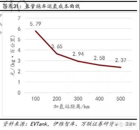 對長管拖車運輸進行成本分析,假設加氫站規(guī)模為500kg/d,國內(nèi)運輸氫氣的管束箱多為20MPa,載氫量約350kg;長管拖車車頭40萬元/臺,管束價格120萬元/臺,10年折舊,平均時速50km/h,百公里耗油量25L,柴油價格約7元/升;氫氣裝卸5小時,氫氣壓縮過程耗電1kWh/kg,平均電價為0.44元/kWh;司機與操作人員費用計32萬元/年,車輛保險10000元/年。測算得到的長管拖車百公里的運氫成本為5.79元/kg,成本隨運輸距離的增加而下降,在500km時運氫成本可下降至2.94元/kg。