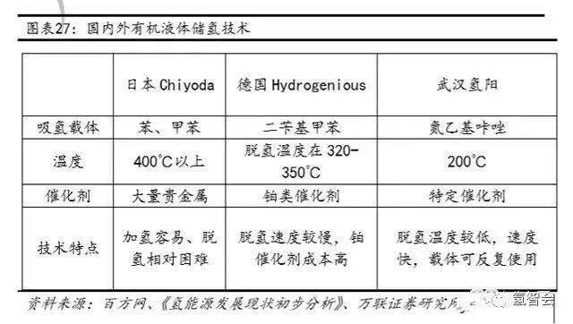 武漢氫陽是國內(nèi)唯一一家做有機液體儲氫的企業(yè),其開發(fā)的常溫常壓下液態(tài)有機儲氫(LOHC)技術攻克了氫氣常溫常壓下液態(tài)儲存和運輸?shù)碾y題,該項技術在世界范圍內(nèi)處于領先地位,相比較于日本Chiyoda和德國Hydrogenious具有脫氫溫度低,儲氫可逆,載體無消耗的優(yōu)勢。武漢氫陽第一批儲氫材料—儲油于2019年3月正式投產(chǎn),一期工程年產(chǎn)1000噸,產(chǎn)值5000萬元,工程全部建成后可年產(chǎn)100萬噸液提有機儲氫材料。