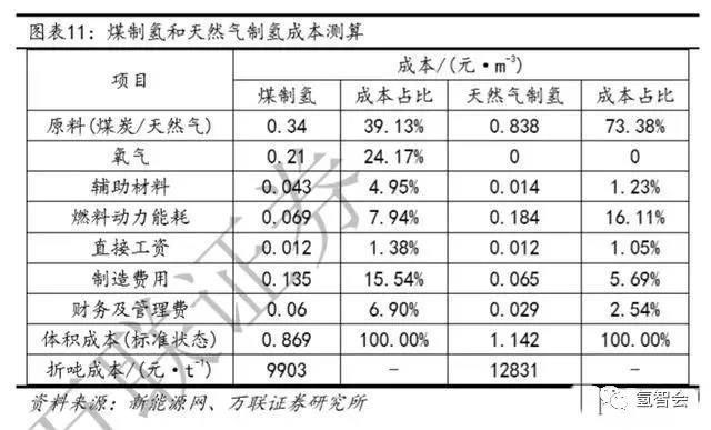 從成本方面來對煤制氫和天然氣制氫進行對比,目前國內(nèi)煤氣化制氫技術的生產(chǎn)成本結構主要有原料,氧氣和制造費用,其中原料煤約占總成本的39%,氧氣占比達到24.17%,制造費用占15.54%,總折噸成本約9903元/t。相比之下,利用天然氣制氫的生產(chǎn)成本中原料成本和燃料動力能耗成本占比約90%,其中原料成本高達73.38%,總成本折噸計算約12831元/噸。天然氣成本高的原因在于制氫成本受原料價格影響大,目前天然氣價格仍處于上行階段,預計成本將高于12831元/噸,同時我國煤炭豐富而天然氣儲量相對較低,40%以上的天然氣依賴進口,因此從成本角度來看,煤制氫仍是更優(yōu)選擇。