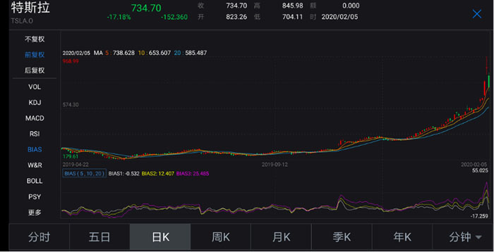 近日資本市場(chǎng)上的表現(xiàn),讓“特斯拉”與“瘋狂”兩個(gè)詞語(yǔ)常常同時(shí)出現(xiàn)。繼上一個(gè)交易日特斯拉日K線幾近收成銳利的“十字”,盤中股價(jià)一度逼近千美元之后,《中國(guó)經(jīng)營(yíng)報(bào)》記者注意到,美東時(shí)間2月5日,特斯拉未能延續(xù)“瘋狂”,股價(jià)低開(kāi)后跌至734.70美元/股,跌幅17.18%。