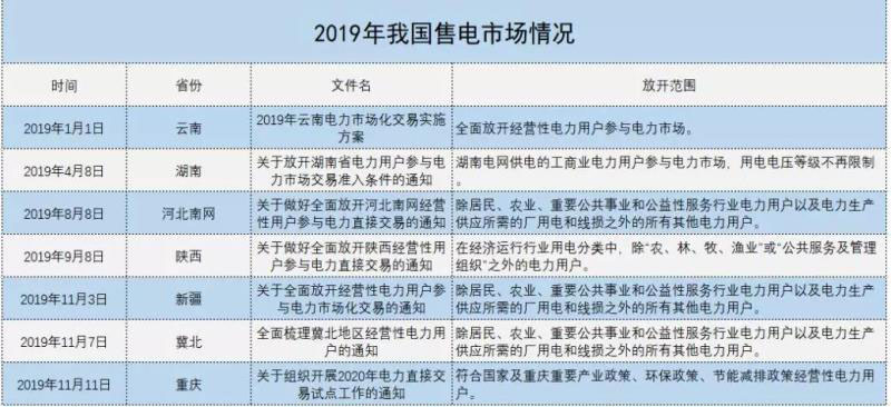 2019年我國(guó)售電市場(chǎng)放開(kāi)步伐全面加速。6月22日,國(guó)家發(fā)改委發(fā)布了《關(guān)于全面放開(kāi)經(jīng)營(yíng)性電力用戶發(fā)用電計(jì)劃有關(guān)要求的通知》。文件稱(chēng),全面放開(kāi)經(jīng)營(yíng)性電力用戶發(fā)用電計(jì)劃,支持中小用戶參與市場(chǎng)化交易。