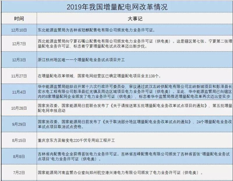 我國(guó)增量配網(wǎng)改革穩(wěn)步推進(jìn)。2019年初,國(guó)家發(fā)改委、國(guó)家能源局發(fā)布《關(guān)于進(jìn)一步推進(jìn)增量配電業(yè)務(wù)改革的通知》。6月份,國(guó)家發(fā)改委公布第四批增量配電業(yè)務(wù)改革試點(diǎn)名單,10月份,第五批增量配電業(yè)務(wù)改革試點(diǎn)開(kāi)始申報(bào),截止日期為2019年12月31日。國(guó)家能源局各派出機(jī)構(gòu)提升了核發(fā)電力業(yè)務(wù)許可證(供電類(lèi))步伐,其中南方能源監(jiān)管局、華中能源監(jiān)管局、東北能源監(jiān)管局派出機(jī)構(gòu),降低審批流程,提升效率,保證增量配網(wǎng)試點(diǎn)穩(wěn)步推進(jìn)。為很多省份增量配電網(wǎng)頒發(fā)首張電力業(yè)務(wù)許可證(供電類(lèi))。