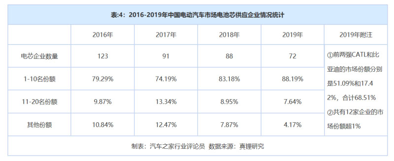 表4的統(tǒng)計數(shù)據(jù)顯示,前10強(qiáng)的市場份額2017年之后快速提升,相對應(yīng),其他企業(yè)的市場份額在快速下滑。預(yù)計2020年前10強(qiáng)的市場份額將突破90%,同時,供應(yīng)電池芯的企業(yè)總數(shù)量可能會在2019年72家的基礎(chǔ)上減半甚至更多。