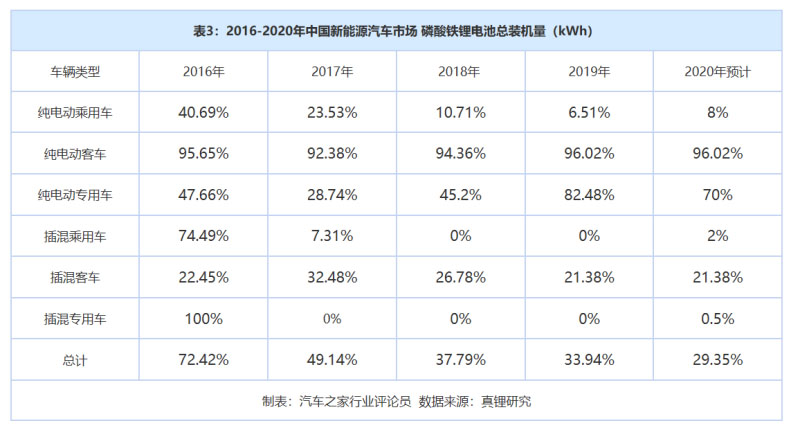 根據(jù)2016-2019年中國電動汽車市場電池裝機(jī)的實際情況,以及2020年已經(jīng)確定的一些變化(如比亞迪確定在純電動乘用車上采用磷酸鐵鋰刀片電池、上汽決定在其部分插混乘用車上采用磷酸鐵鋰電池等等),對2020年磷酸鐵鋰電池在各類電動汽車產(chǎn)品上的裝機(jī)情況做了一個預(yù)測,見表3。按照這個預(yù)測來看,2020年磷酸鐵鋰電池裝機(jī)量會有一定增長,但裝機(jī)占比將會繼續(xù)下降并首次降到30%以內(nèi)。相對應(yīng),三元電池裝機(jī)占比將接近70%,繼續(xù)擴(kuò)大領(lǐng)先優(yōu)勢。