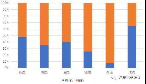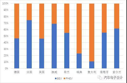 圖10 主要的歐洲國家的PHEV和BEV的銷售比例