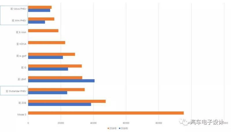 圖7 2019年歐洲暢銷新能源車型和2018年的比較