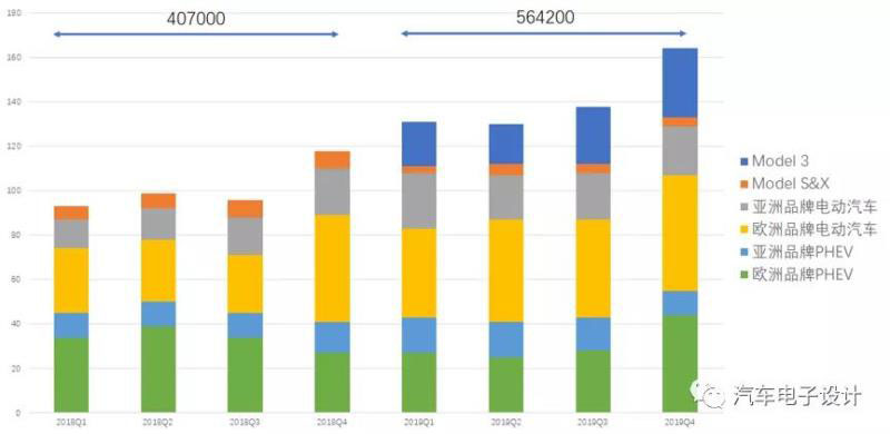 從下圖來看,從2018年每個季度不到10萬臺,2019年每個季度都在13萬臺以上,而沖刺的2019年Q4更是達(dá)到了接近16.4萬臺。如果分不同品牌的PHEV、BEV,特斯拉的Model 3能單獨(dú)拉出一個品類來,2019年在歐洲的銷量為95247臺,市場占有率為17%。2019年我們看到了歐洲車企在本土市場的發(fā)力,在PHEV和BEV方面還是做出了相當(dāng)多的努力,但是整體的增長情況并不是特別如意。