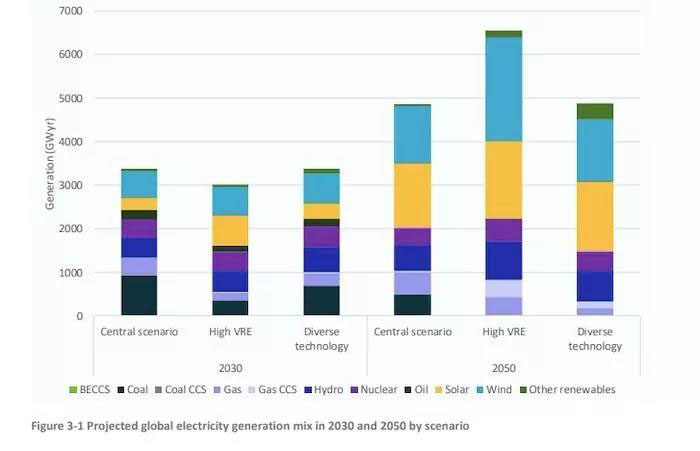 研究模擬了集中式、高比例可再生能源滲透和多樣化技術(shù)三種情景進(jìn)行分析,而幾乎在所有的場景中,CSIRO的研究均預(yù)計到2050年全球能源格局將由風(fēng)能和太陽能主導(dǎo)。核能可能會在“多樣化技術(shù)”的場景中扮演一個稍微重要的角色,但這只是人為限制了風(fēng)能和太陽能的使用。