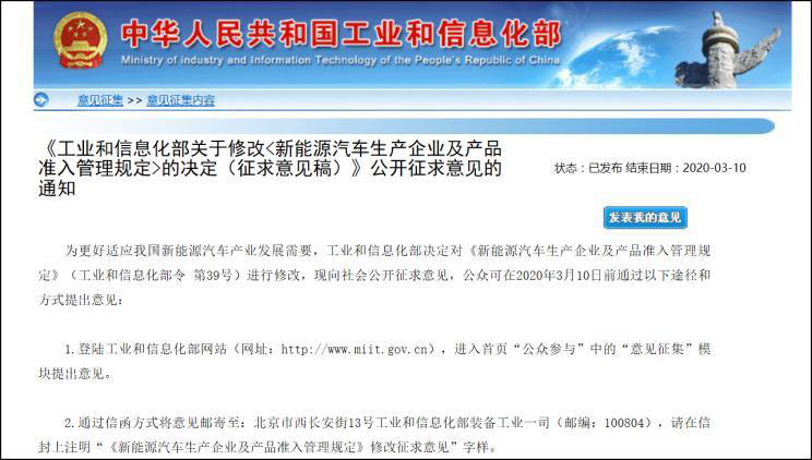 2月10日,工信部發(fā)布《工業(yè)和信息化部關(guān)于修改<新能源汽車(chē)生產(chǎn)企業(yè)及產(chǎn)品準(zhǔn)入管理規(guī)定>的決定(征求意見(jiàn)稿)》公開(kāi)征求意見(jiàn)的通知,具體調(diào)整內(nèi)容主要有: