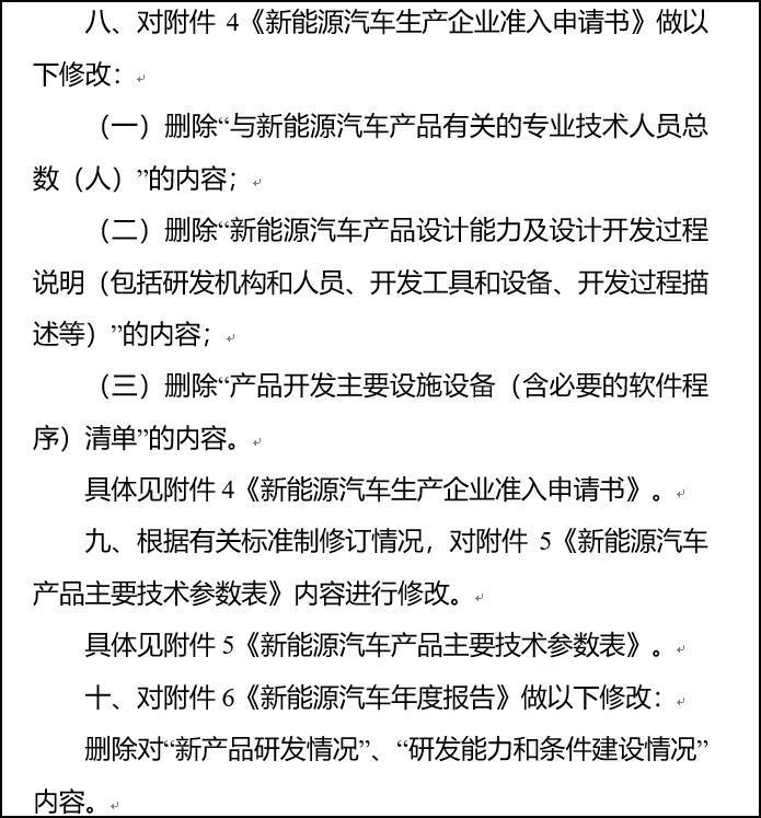 三、其他修改內(nèi)容以刪減為主,如原第二十九條、第三十條、第三十一條內(nèi)容被刪除,如附件4《新能源汽車(chē)生產(chǎn)企業(yè)準(zhǔn)入申請(qǐng)書(shū)》中,刪除了“與新能源汽車(chē)產(chǎn)品有關(guān)的專(zhuān)業(yè)技術(shù)人員總數(shù)(人)”、“新能源汽車(chē)產(chǎn)品設(shè)計(jì)能力及設(shè)計(jì)開(kāi)發(fā)過(guò)程說(shuō)明(包括研發(fā)機(jī)構(gòu)和人員、開(kāi)發(fā)工具和設(shè)備、開(kāi)發(fā)過(guò)程描述等)”、“產(chǎn)品開(kāi)發(fā)主要設(shè)施設(shè)備(含必要的軟件程序)清單”等內(nèi)容。